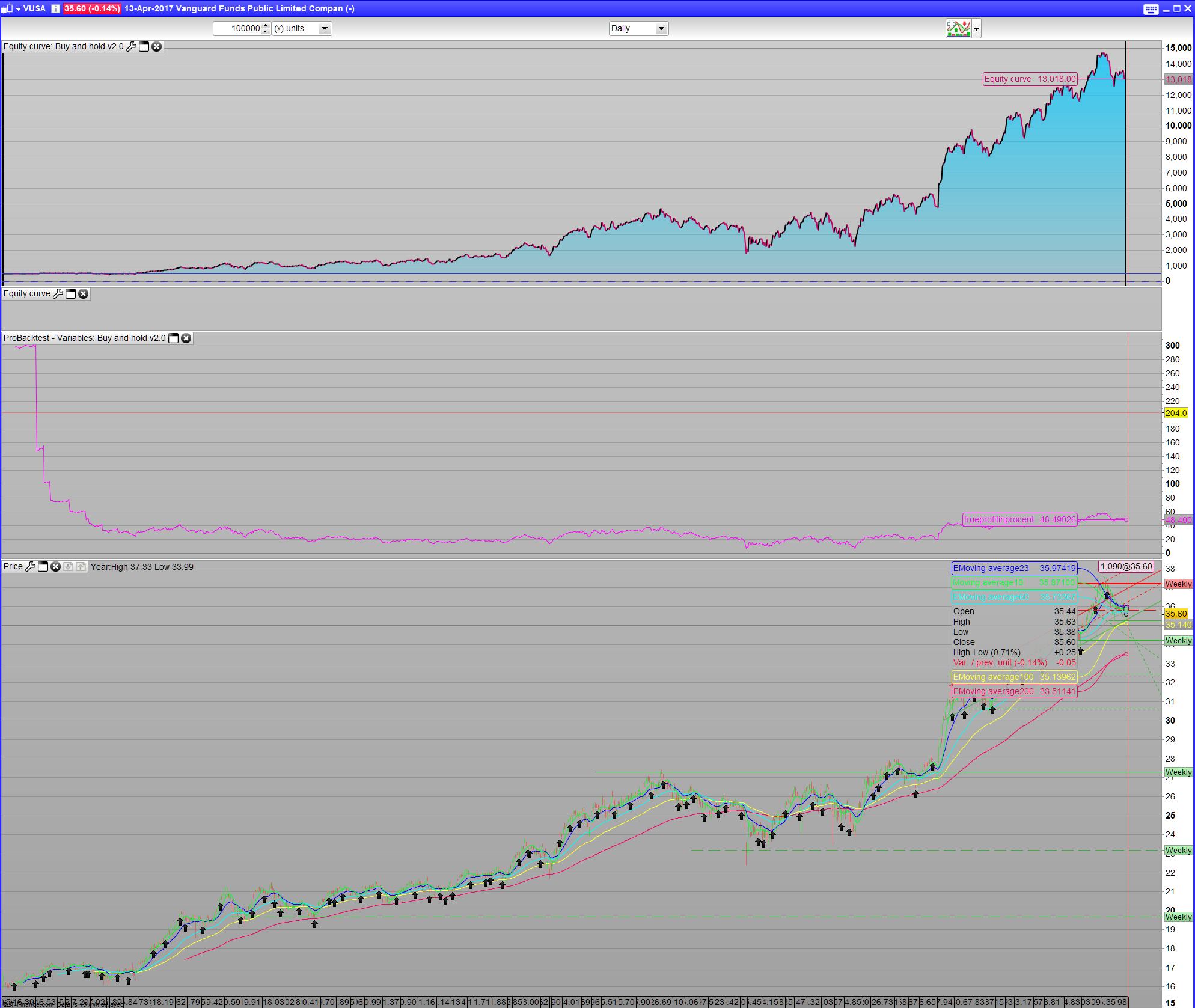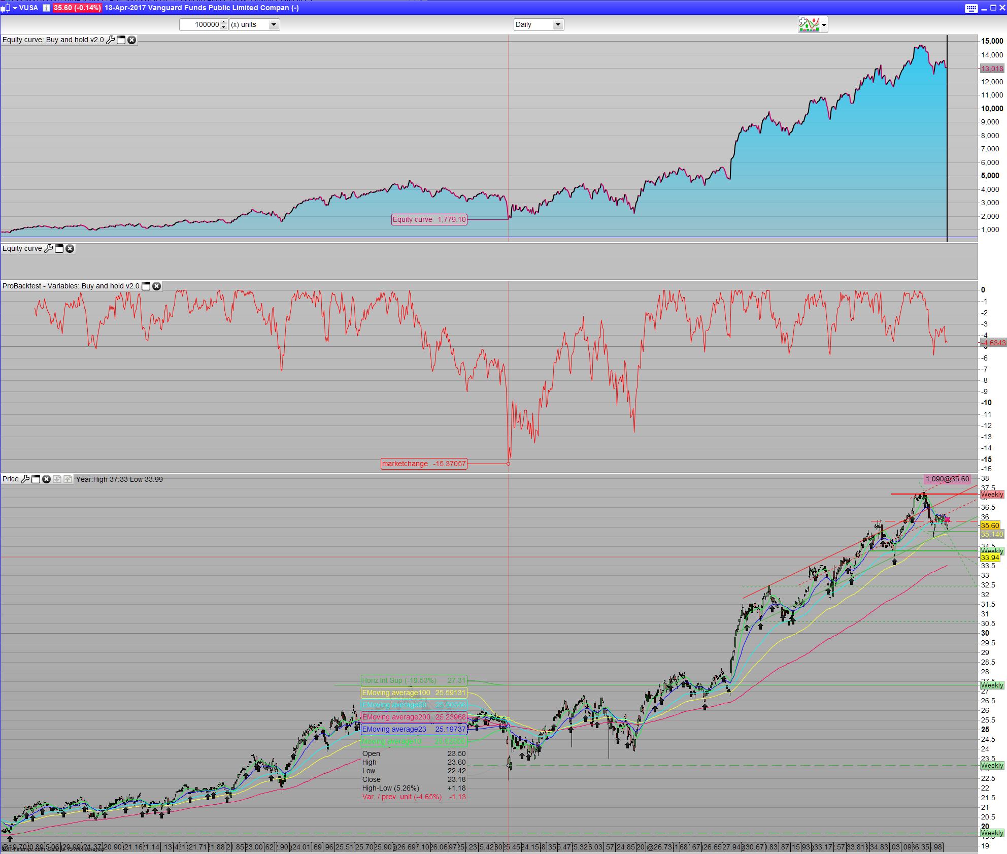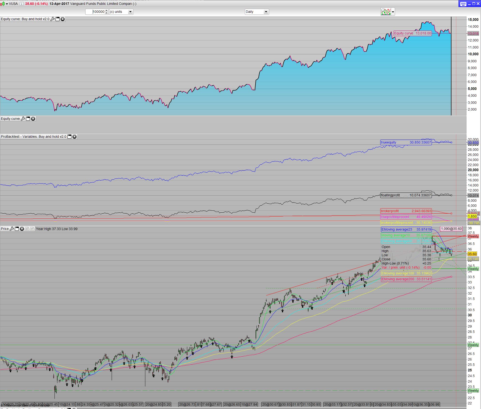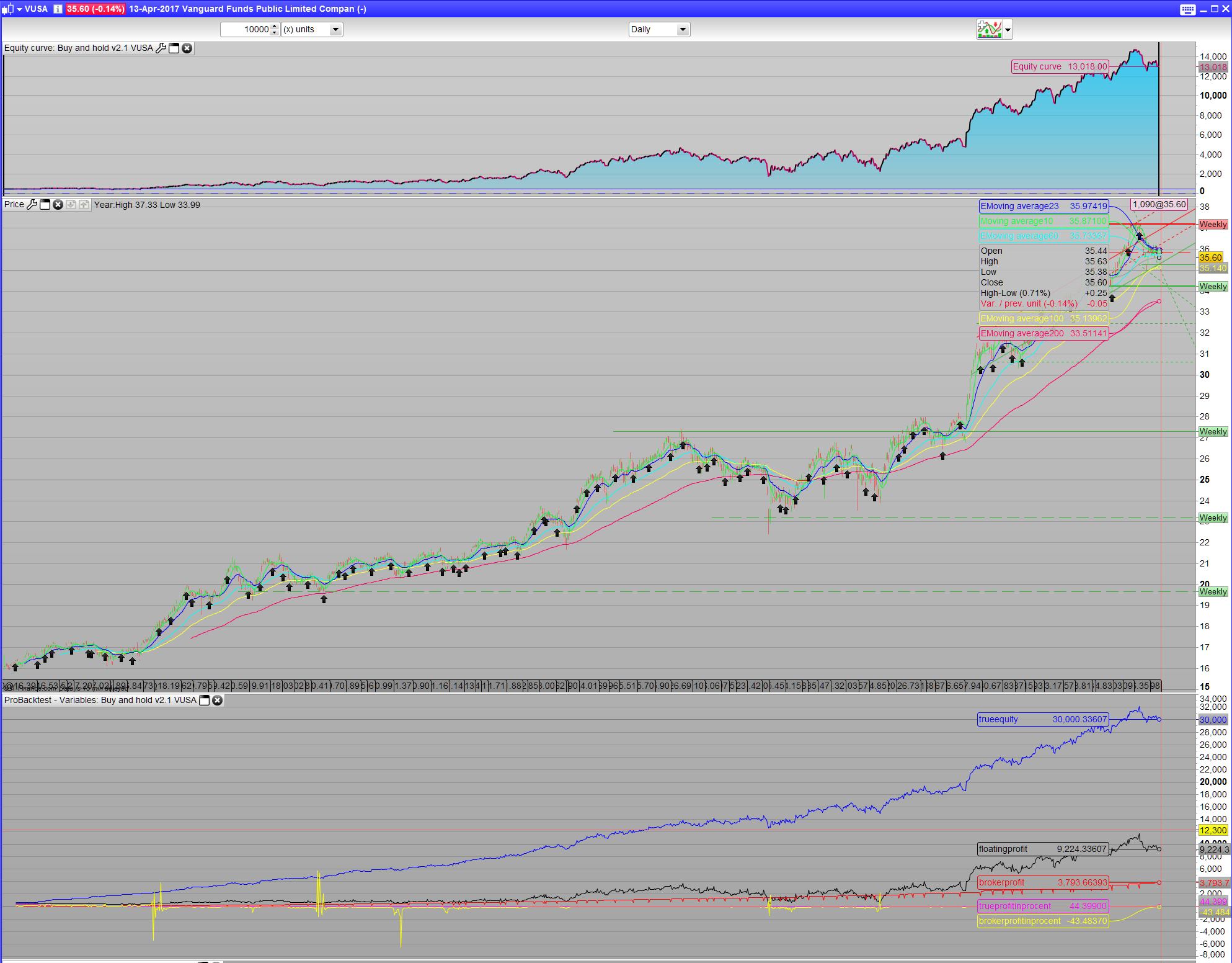 It took a couple of tries and emails from IG’s part to finally come up with the formular for my chosen Instrument- the Vanguard Funds Public Limited Companey – Vanguard S&P 500 UCITS ETF. For a positionsize of 5 it would yield (5 x 35.6425 x (2.5% + 0.25%))/365. This would give a total of £.0.0134 per evening. I rewrote the formula to overnightfee=(positionsize x tradeprice x 0.0275)/365. Comission is a ballance. The commission pr trade, charge is 0.10% of total tradeprice or $10, whichever is higher- so the code takes care of this, but around 290 positions is the ballance. It also dependant on the current price. However more or less 600 position buy a month is rather costly. We could take trades 4 time a year, so comission becomes insignicant. But for large account that can afford these trades it’s left as 2 trades a month. We will see that the comission is almost not important anyway. I make a total of 10 x 2 positions a month which is 20 euro a month in commision. In the end it’s a matter of choice of how much you spend to make money vs. How much you can afford save each month