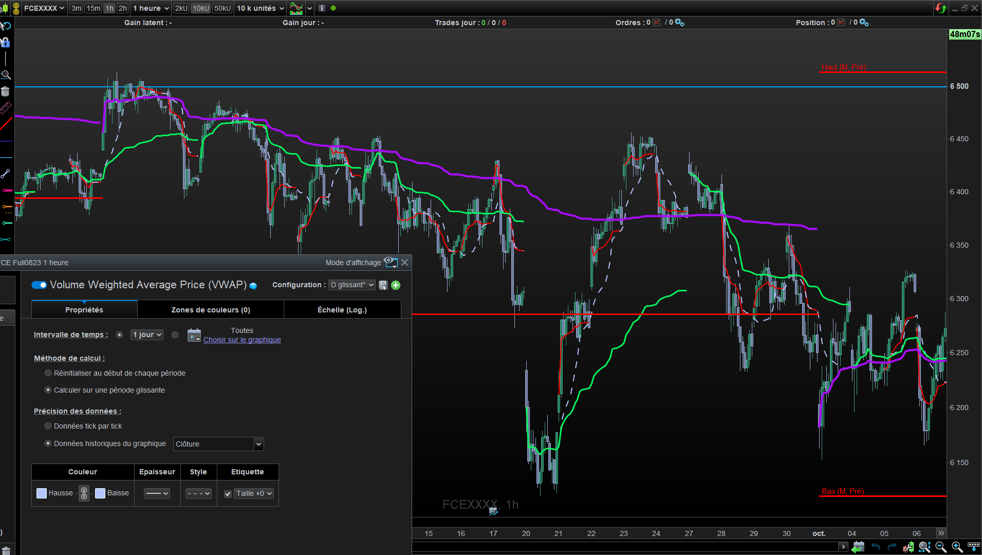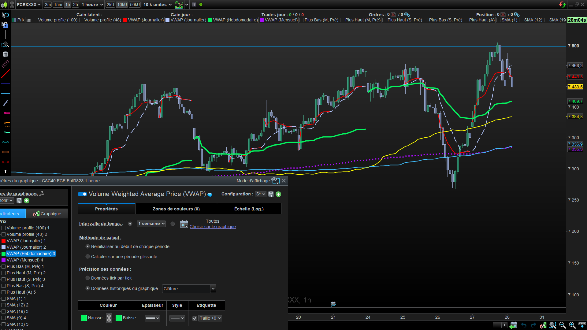 je reviens vers vous pour trouver une solution. Dans ma stratégie automatisé, j’aimerai insérer un indicateur VWAP, ou je pourrai choisir de faire apparaitre la ligne du VWAP MONTHLY, WEEKLY et DAILY, HORAIRE et Minutes, mais qui se REINITIALISERAIENT au début de chaque période, et pour chacune des periodes. En fait cet indicateur existe sous PRT, mais il m’est impossible de placer des conditions dans ma stratégie vu que je n’ai pas la possibilité de l’importer via la fonction (Fx) dans probacktest.
