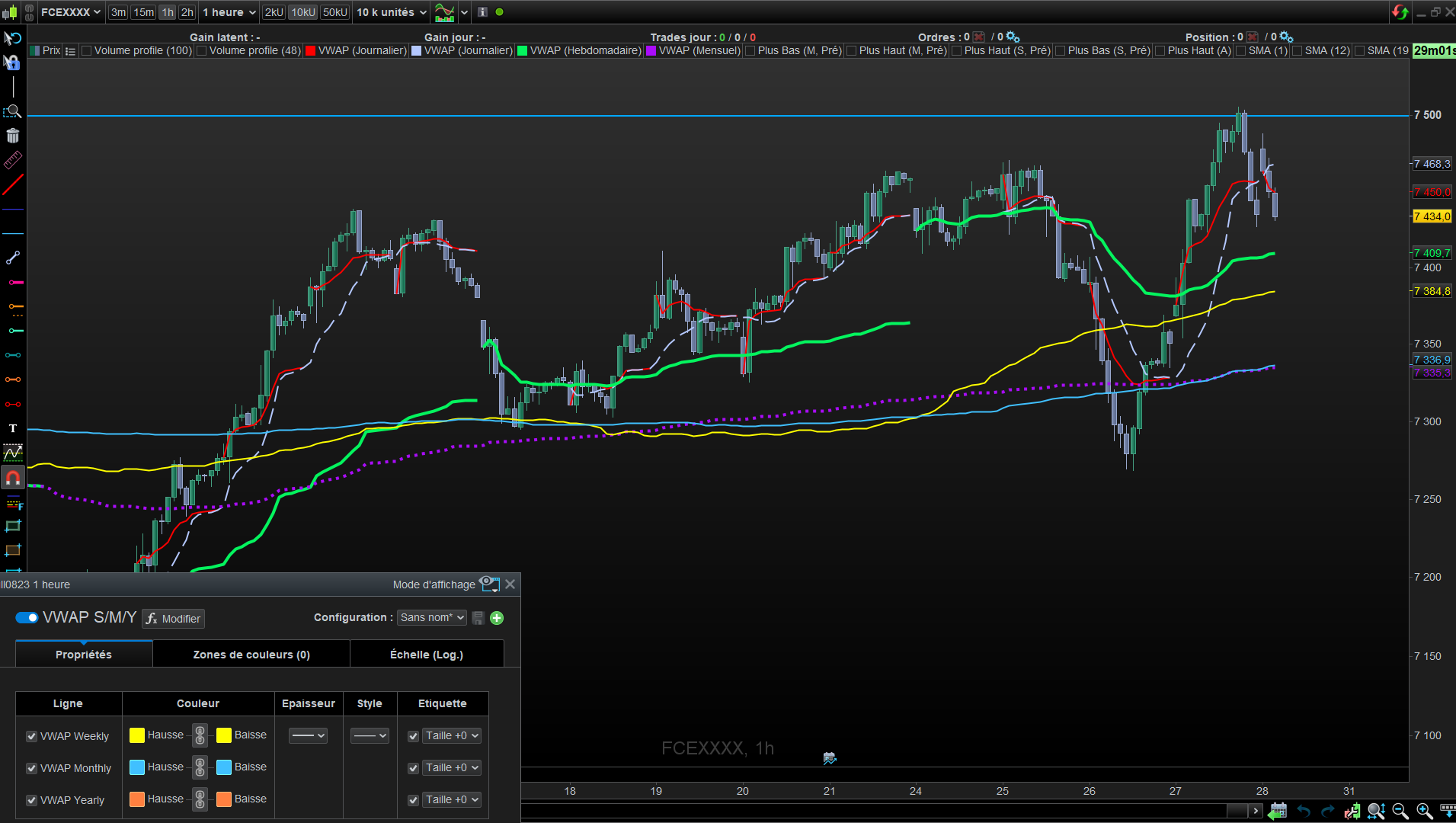 je vous joint deux images, la première avec les réglage de vwap Weekly en vert de PRT, et la deuxième avec le vwap (W,M,Y). On voit bien que les lignes ne sont pas réinitialiser a chaque périodes.
