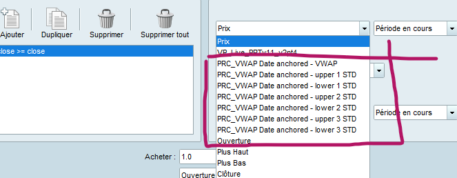 If you need your vwap to be in the price window because your screener or backtest conditions make it interact with price or other items from this window, you have to go to top left corner click on “price” then “add indicator” and add your vwap there (rather than in separate window below). And then when using simplified creation of screener/backtest, it will be available in the list when clicking in the price window.
