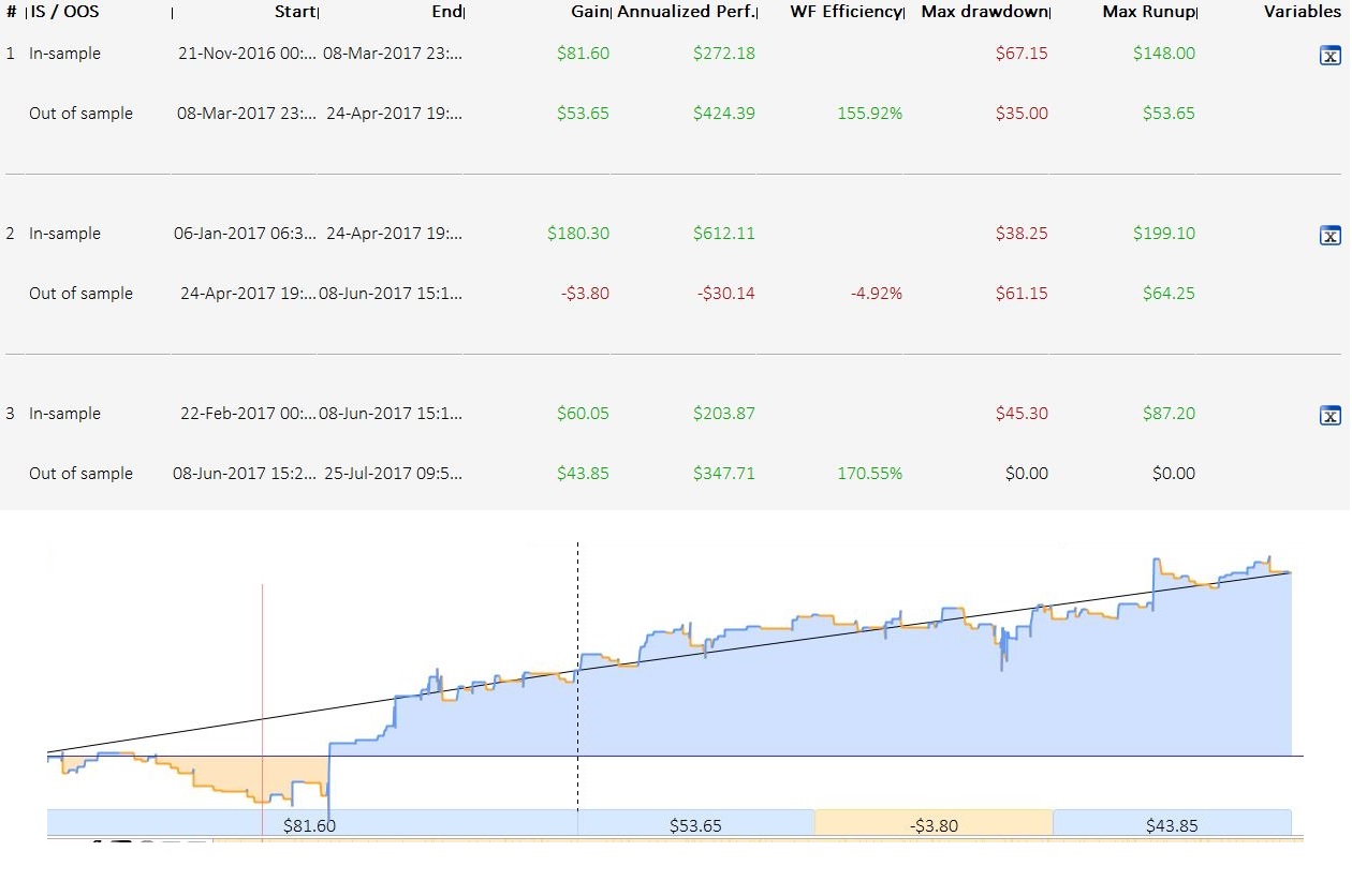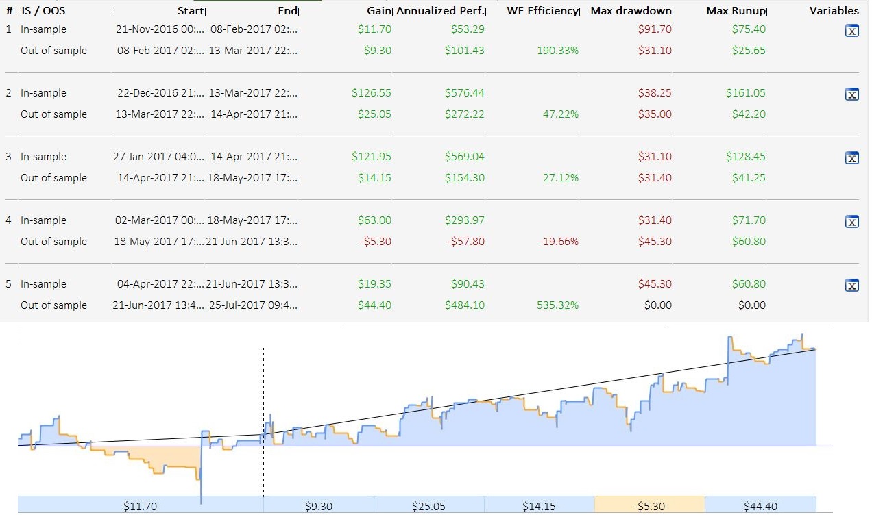 If you run the 5 repetitions AT ONCE in 1 Walk Forward Analysis run, the optimised variables for the second till the fifth repetition may vary significantly from the first one. However an overall Walk Forward Efficiency Ratio is presented, adding the five OOS results together in an annualized WFE ratio with different optimised variable settings.