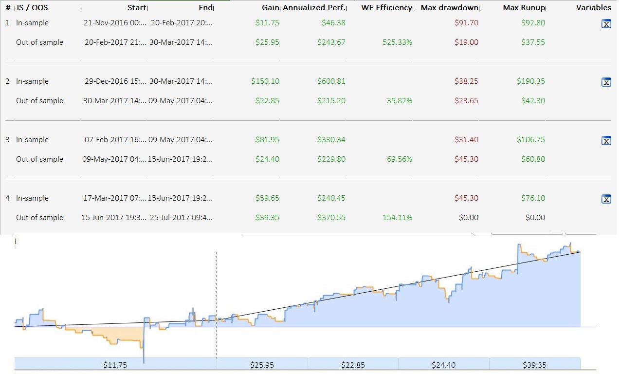 The WFA is conceived to know if your strategy benefit from optimisation. A strategy is considered as “robust”, understand good enough with optimized variables, if the WFE are good (>50% for the most of them, not too high, etc.).
