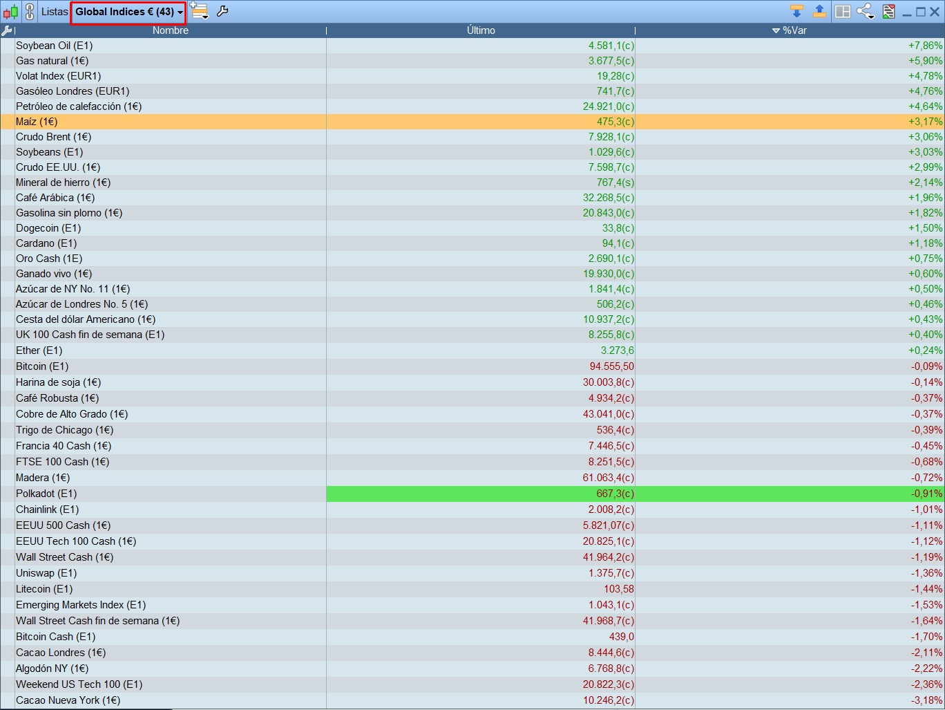 En PRT he visto la lista “Global indices 1€”, que se puede ver en la imagen adjunta. Me pregunto si existe la posibilidad de hacer un WF aplicado a la lista de activos, en lugar de activo a activo.