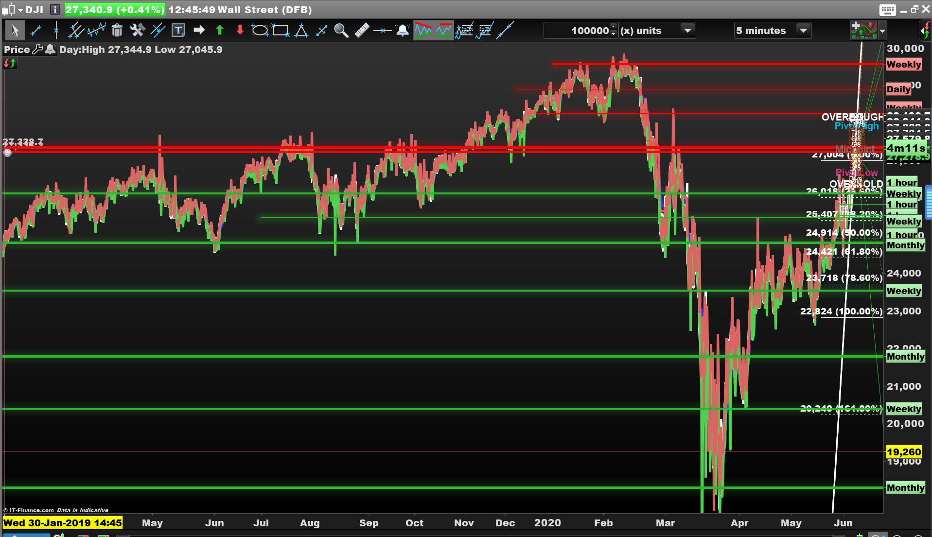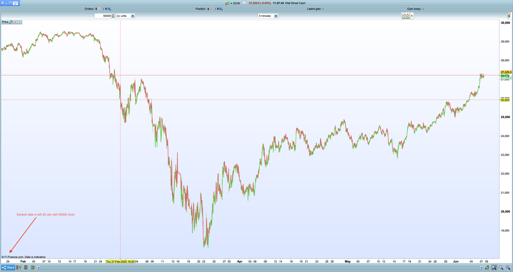 Hi, thanks for your reply. Four screenshots attached. The first, 30000 units shows the date range when I ask for 30000 x units for the DJIA Wall Street Cash on the 5 min chart (same problem on anything less than 1 day). Earliest date shown 29th Jan 2020. Second chart shows what happens when I ask for 50000 units, earliest date remains the same. Same thing happens if I ask for anything higher, ie. 70000 or 100000 units. Only have this problem on the DJIA.