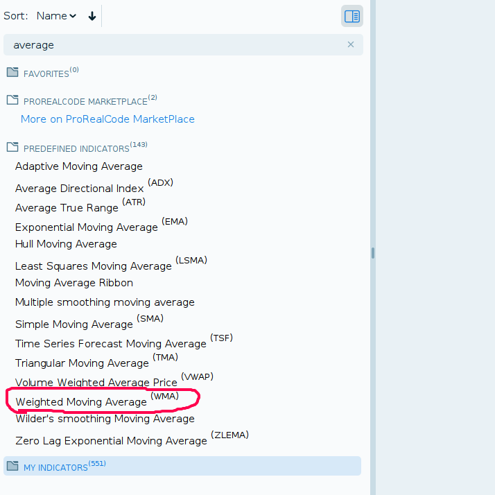 Filtrando per media, vedrai tutti gli indicatori correlati. Quello che stai cercando è WMA. Tuttavia, se inserisci una media mobile semplice, ad esempio, puoi trasformarla in una media ponderata nelle impostazioni dell'indicatore. Nel codice ProBuilder, puoi scriverla in due modi.