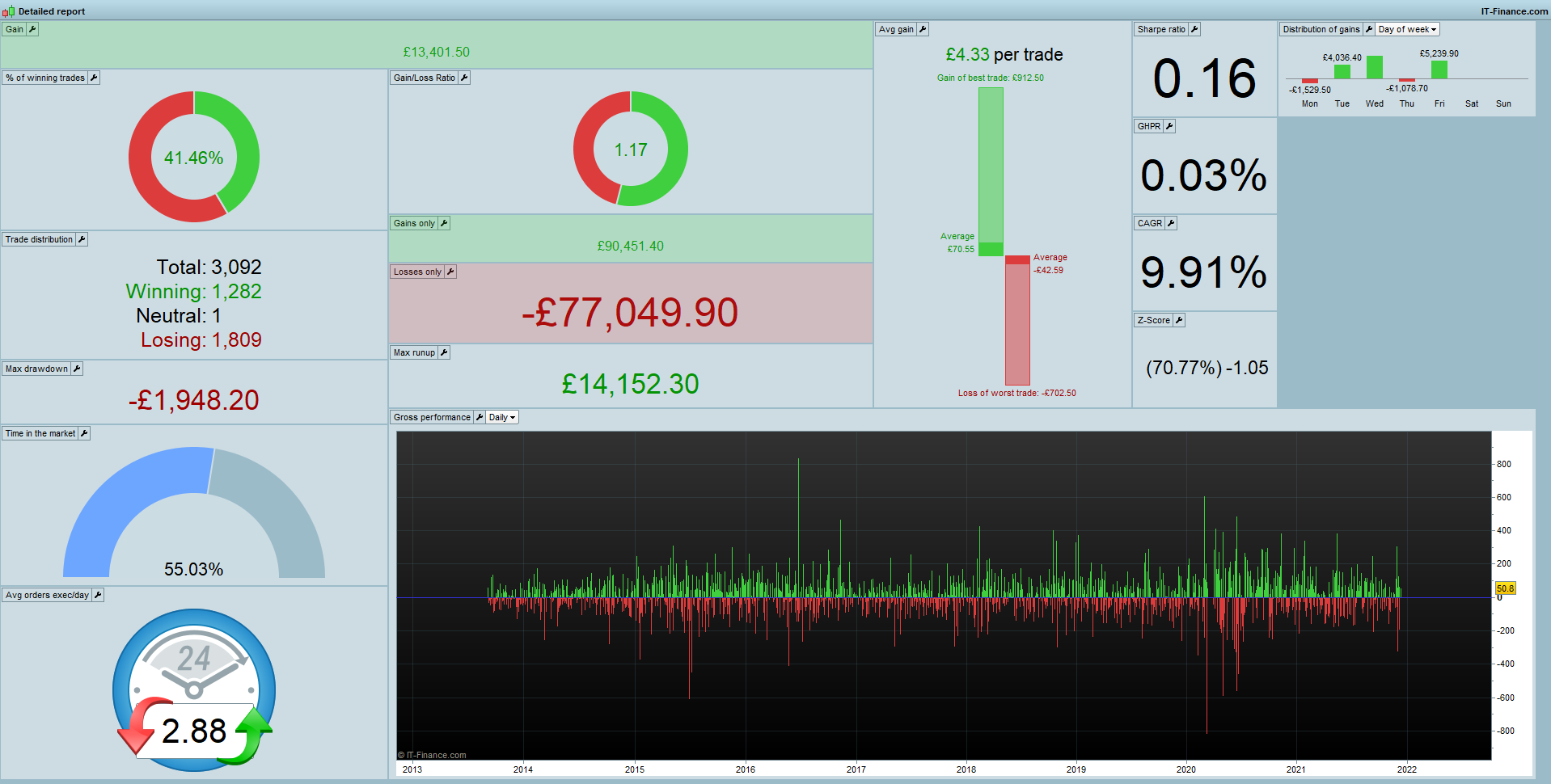 Anyway, I have become rather confused upon finishing what I consider the last phase of development: robustness testing. I am using the Walk Forward Analysis tool and the problem is that I am not sure how to interpret the Walk Forward Efficiency ratio results…. here is the WF Efficiency over 5 stages at 70/30. (Apologies, I can’t save the ‘Walk Forward statistics’ tab itself for some reason, when I try to ProRealTime instead saves the ‘Advanced Chart’ tab, any ideas why this is?? I am able to save the ‘Detailed Report’ tab which I have included.)