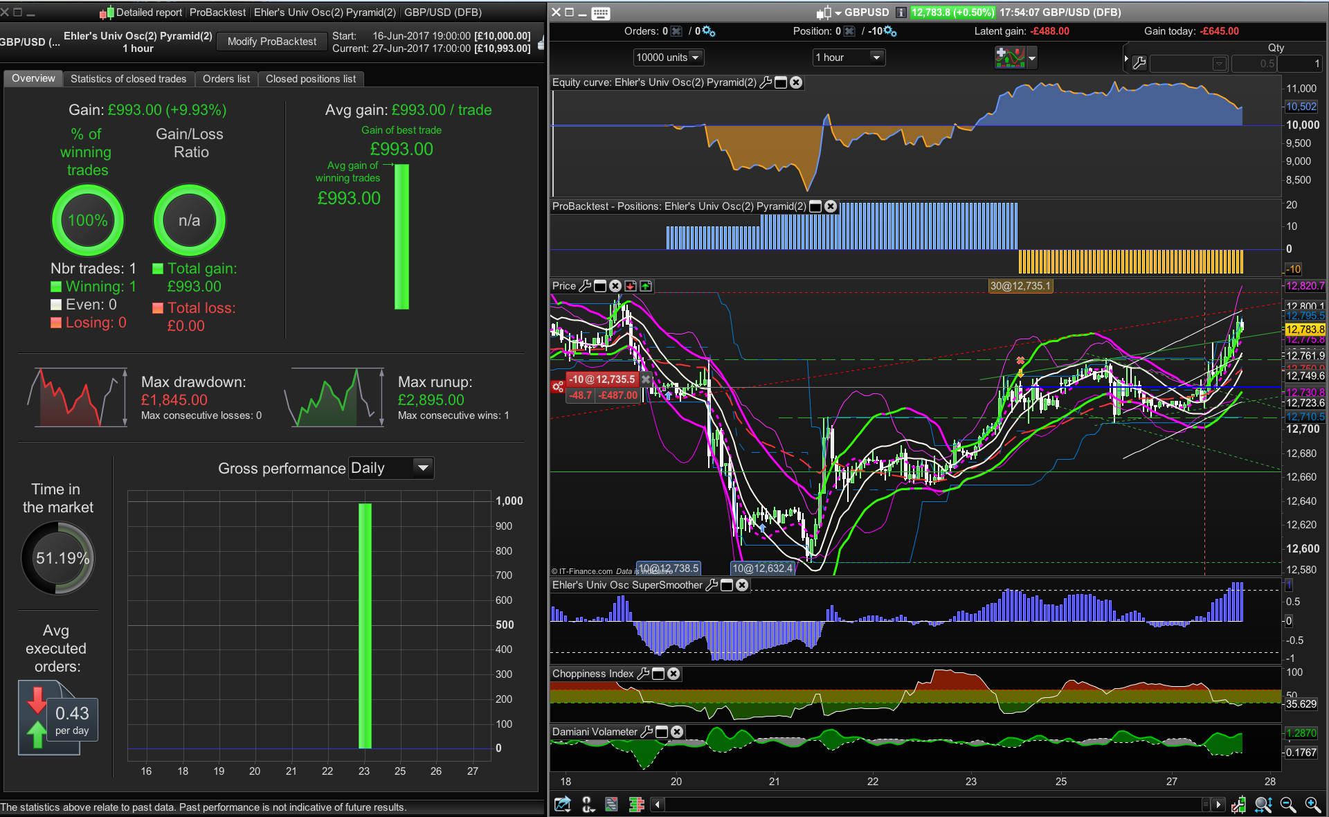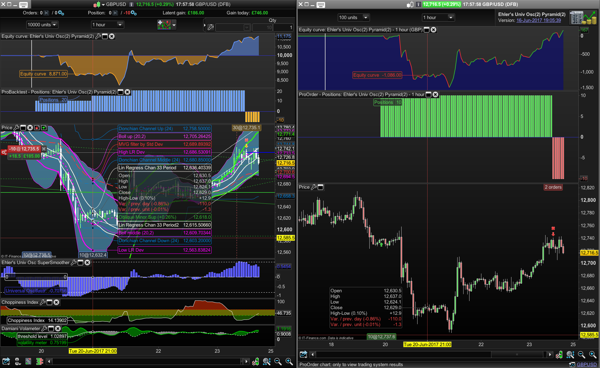 The “strategy” code is posted above (pls ignore/delete the Short side “AND C2”) and the screenshots are below (View Performance v’s Backtest). Both start at 19.00pm on the 16th June, London hours, £/$ DFB, 1 Hour.