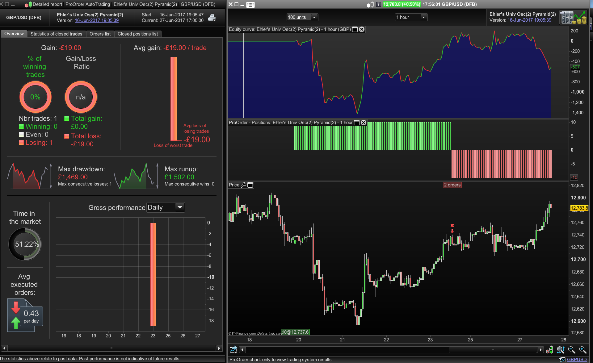 Thanks for the backtest v’s live performance chart tip, appreciated. The thing is when I do that and run the backtest from 19/06/17 22.00hrs (launch date) I get a £1027 profit and if I look at the View Performance it ‘s down £19. The reason being is that the £1k profit was made from 2 positions (£10/tic for both the first trade and then the 2nd position).