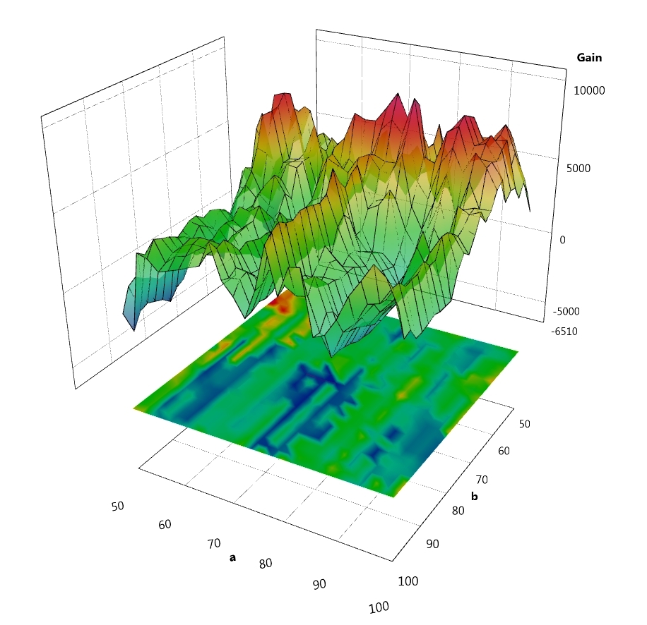 Flat area gives valuable information of variables not too much over-optimized. While comparing a set of optimized variables with gain, we should not consider the peaks (usually painted in red) that represent somehow the abnormal situations, which deviate from the ordinary distribution of variables that have given good results. Hope I’m clear 😉