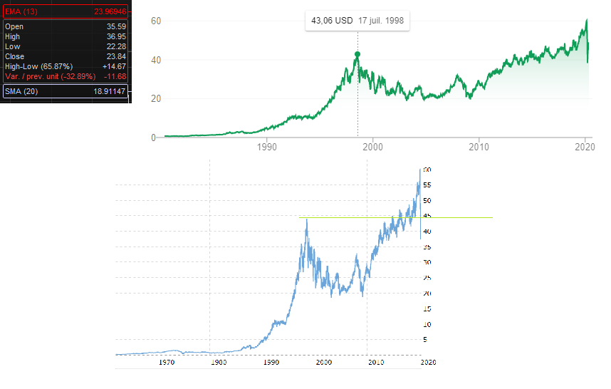 Let take the example of KO stock, in PRT I have the maximum value is around $37 in June 1998.