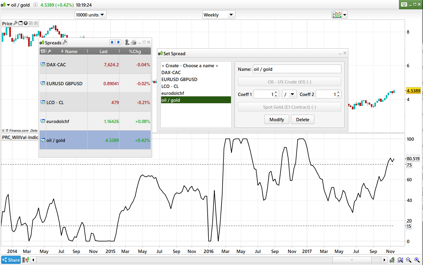 Unfortunately, this indicator is not possible to be made through ProBuilder, because there is no possibility to compare 2 securities with code… But, we can construct spread chart (with CTRL+R), so I assume there might something possible by constructing spread chart with any commodity divided by Gold price. Then on this spread chart, add the Will Val indicator.