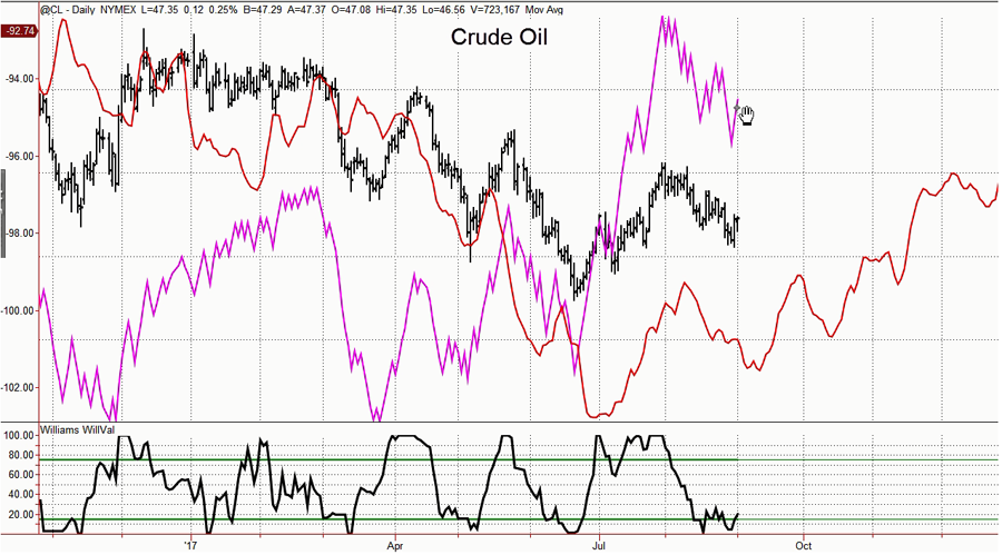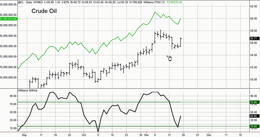 In allegato posto il grafico del petrolio(Crude oil) dove c’è il Williams Valuation(Will Val indicatore sotto in nero) dove si vede come in questo momento sia sottovalutato e quindi con aspettative rialziste. Si noti anche come dalla fine del 2016 come l’indicatore abbia fatto il suo dovere quando il Petrolio si è trovato sui massimi e sui minimi.