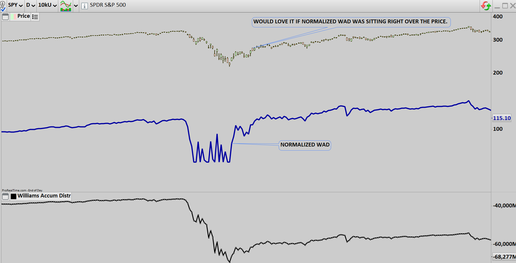 Thank you, but I have another question. Is there any way to plot this Normalized WAD right over the price instead of running it parallel and at a distance? I would love to actually overlay straight on Price rather then run it parallel. Please see picture below to see how it appears now and Normalized WAD is a blue line.