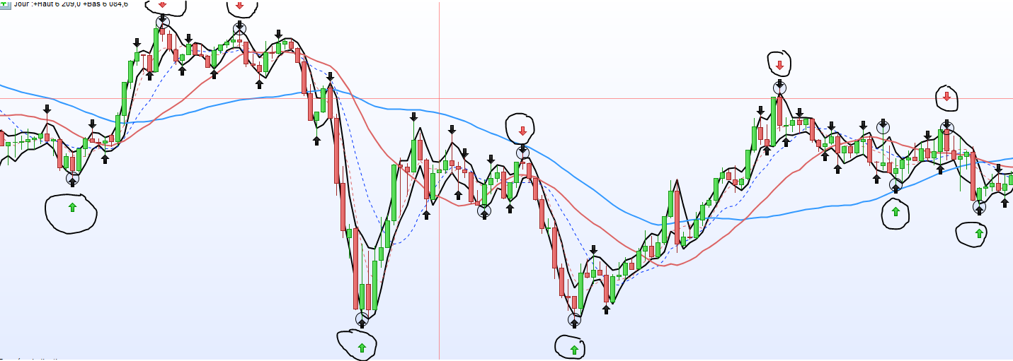 Sur la capture d’écran ci-joint, les entrées et sorties sont marquées par les flèches noir. Bien sûr je ne comprends pas bien comment les points d’entrées et sorties sont fait dans le programme de l’indicateur. J’aimerais dans un premier temps entrer a l’achat sur les flèches verte et vendre sur la flèche rouge qui sont entourées, et pour la vente a découvert sur la flèche rouge et le rachat sur la flèche verte. Ceci étant pour éviter toutes les prises de positions indiquées par les flèches en noir. Je pensais a l’associer à une martingale de Hawks.
