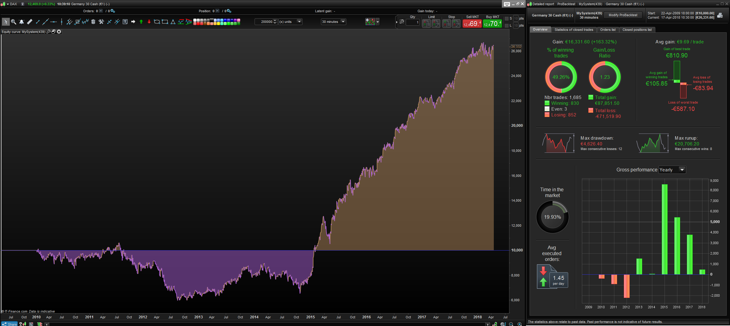 I have had it on Demo Live for a few weeks now and it has performed quite well but I note that it closes positions at 2200. These closures show as closing at 22.00:01 on my results. I am on British Summer Time which is UTC + 1 and IG charges overnight fees if positions are held at 2200 UK time so I am guessing that I am being charged overnight fees for holding the bet for one second! It is difficult to tell as I have lots of strategies holding overnight and IG do not clearly identify which charges are on which strategies.