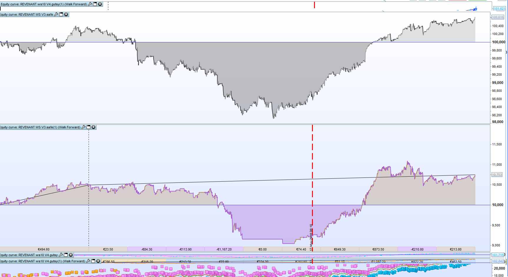 Sorry for the double post but i cant edit my comment, wanted to add this photo that might be a bit more clear. Blue line is just to show when it started to become profitable, and RED verticle line = where the data sample (100K bars PRT complete version) starts, and from there the system was created and optimized.