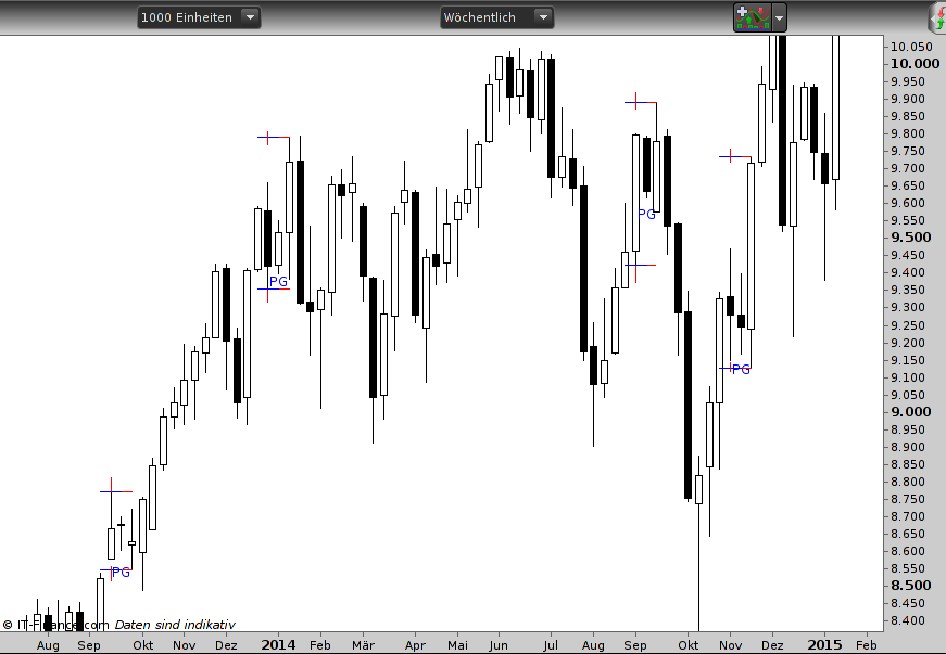 Indicator is a PopGun marker. Every timeframe (based minute, hour, day, month, quarter) is calculated and therefore drawn correctly in the chart – except all weekly based data (like weekly, 2 weeks, 3 weeks…).
