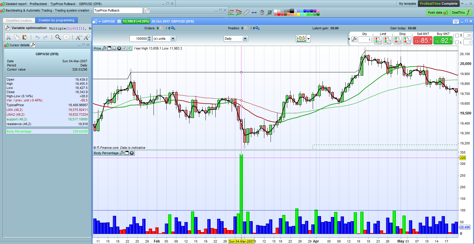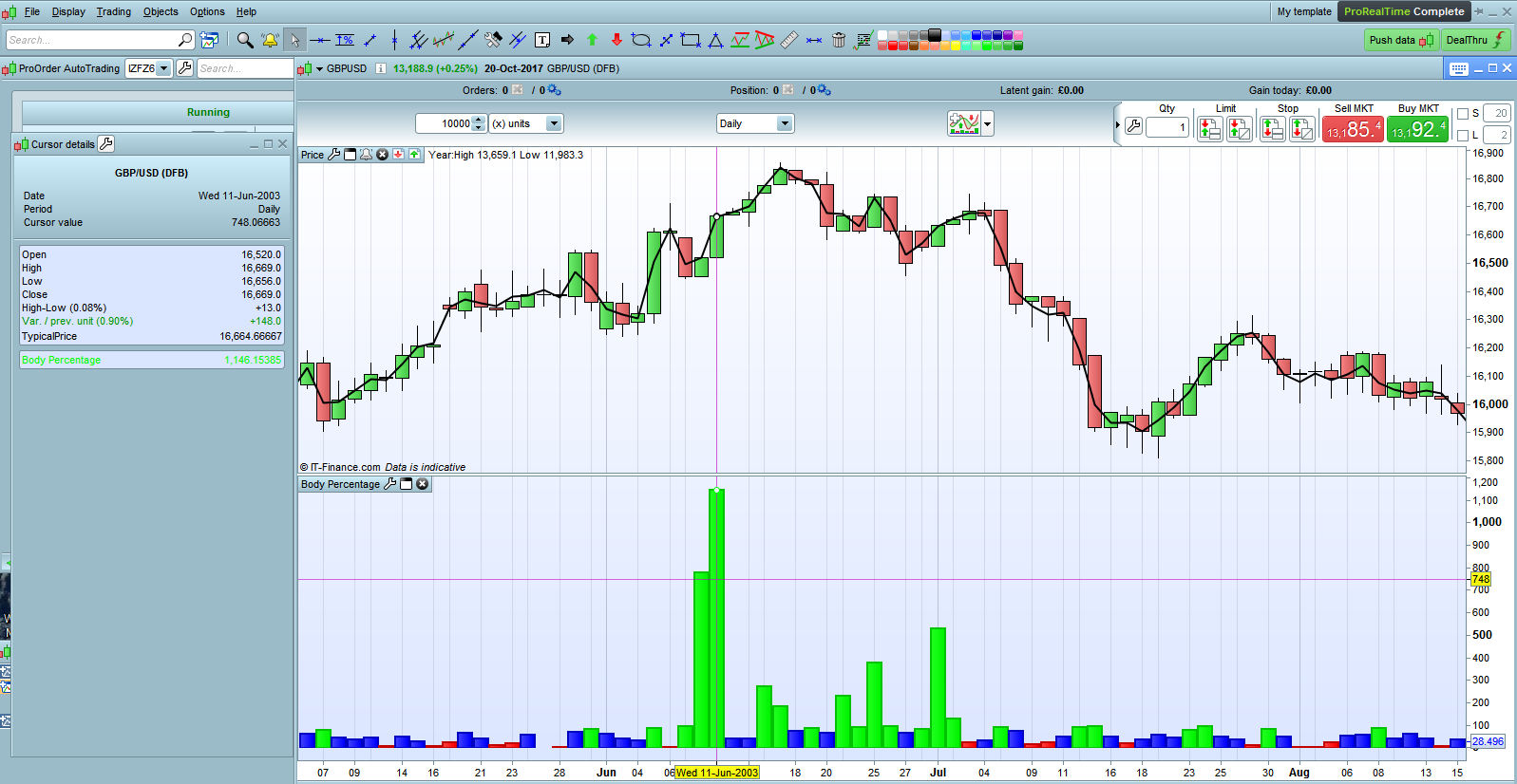 Thanks for the suggestion AVT but a high will always be higher than a low so the result will always be a positive from (high-low). The fault is in the data supplied from IG/PRT as if you check the numbers in the cursor details panel shown in the image the range is smaller than the body of the candle, which is impossible.