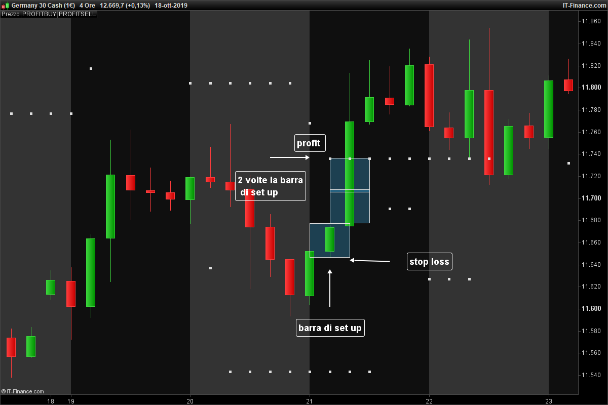 grafico orario, alle h 9 entro sul massimo della barra oraria delle ore 8, metto lo stop loss al minimo della barra delle h 8, il profit due volte sopra il max della barra delle h 8 del valore di stop loss : profitbuy =high+(2*(high – low))