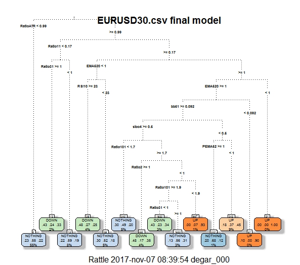 The file uses rpart training method to obtain decision trees, without pre processing to maintained values scales of each indicators.
