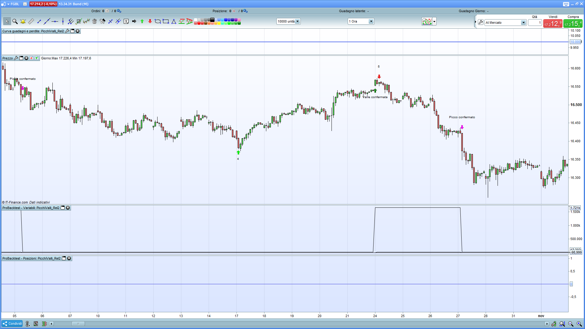 Per aiutarmi, graficamente, ho modificato il vecchio indicatore aggiungendo una freccia di color verde scuro – ed il testo “Valle confermata” – in corrispondenza di quella barra che decreta la conferma dell’ultima Valle.