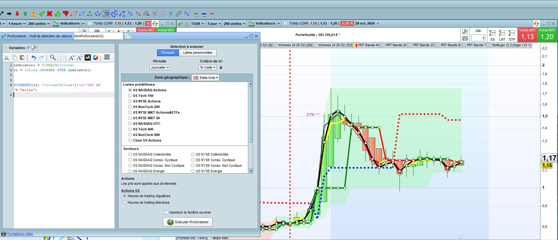 En vue Jour / Le prix croise a hausse la ZLEMA Vue HEBDO ( Zero retard Exponentienelle a 1 periode en cloture et ecart type a 1