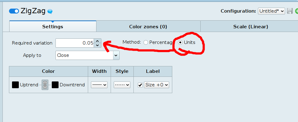 Salut. L'indicateur zigzag fourni par défaut sur la plateforme peut être configuré. Vous pouvez choisir entre une variation en % ou en unités.