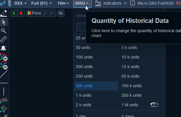Je ne suis plus certain pour la v12, mais dans la v13 on modifie la quantité d’historique voulue (comme dans l’image jointe), on sauvegarde la plateforme (CTRL+S sous Windows), et dés qu’on ouvre le graphique, c’est cette quantité d’historique qui sera ouvert par défaut.